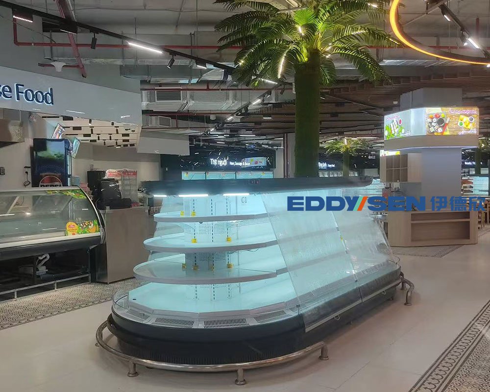 Eddysen air curtain fridge widely used in supermarkets, meeting the needs of island display areas with high foot traffic, frequent customer access to goods without needing to open the doors, and maximizing product display from multiple angles.