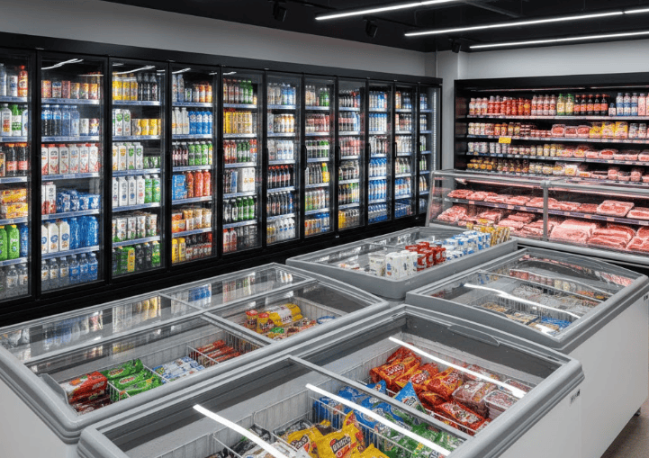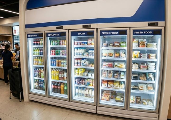 Glass Display Refrigerators – High-visibility display for beverages and ready-to-eat products.